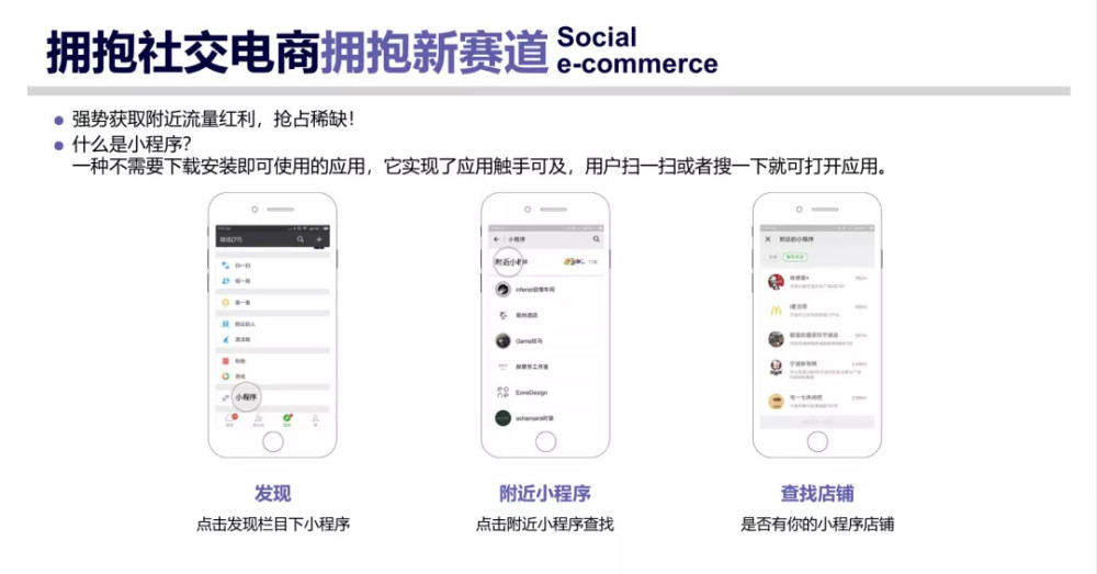 社交电商最响的一个口号是,让商家建立自己的流量中心,摆脱平台的绑架。但是事实上这个宏愿一直没有实现,因为之前商家们用的H5工具有一个最大的限制——分享之后没法返场。但小程序就完全不同了,用户点击之后就会成为小程序用户,即便不消费都会与商家产生关联。
